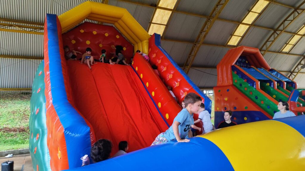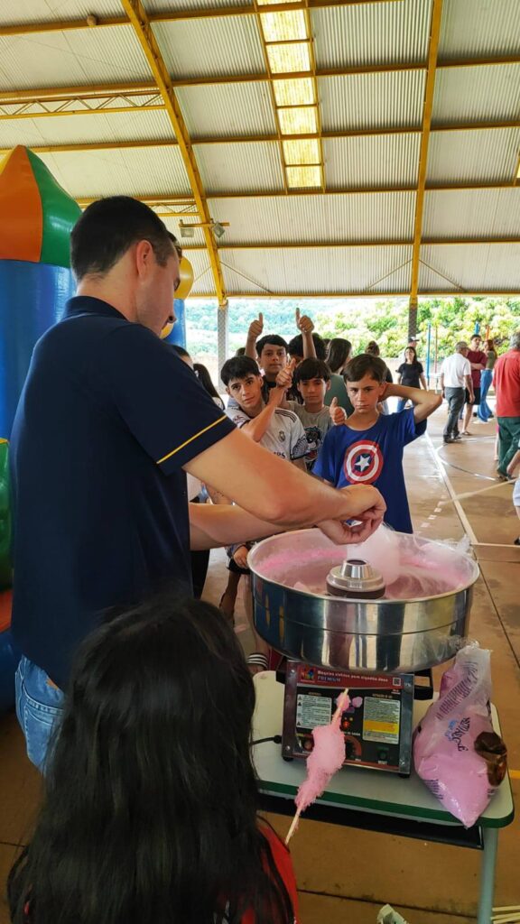 Além dos brinquedos infláveis, a programação contou com algodão-doce, pipoca e sorvete. O preparo do algodão-doce foi realizado pelo Rotary Club, enquanto os insumos foram custeados pela Secretaria de Assistência Social. Já o cachorro-quente distribuído às crianças foi organizado pela Secretaria Municipal de Educação, reforçando o trabalho integrado entre as pastas.