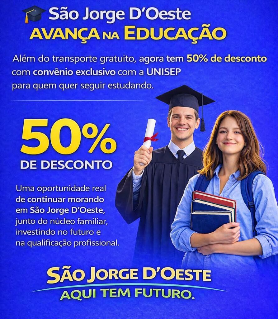 Com políticas públicas que incentivam o ensino superior, São Jorge D’Oeste se consolida como um município em expansão, que cresce, gera oportunidades e acredita na educação como motor do progresso. A parceria com a UNISEP reforça esse compromisso e projeta um futuro de mais conhecimento, qualificação e desenvolvimento para toda a comunidade.