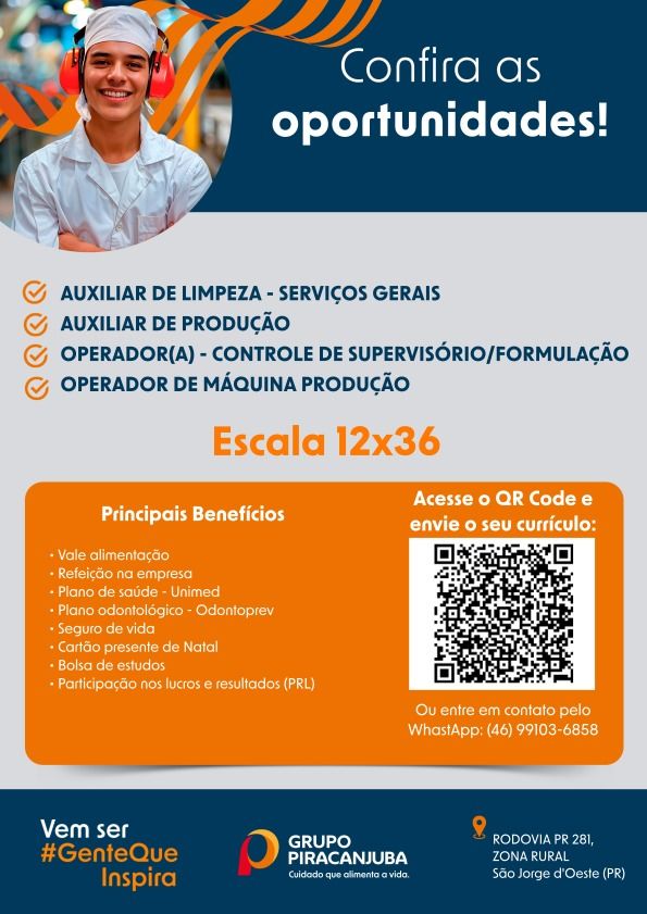 O Grupo Piracanjuba está com vagas abertas para compor a equipe da nova unidade em São Jorge d’Oeste – PR. Venha fazer parte do nosso time!